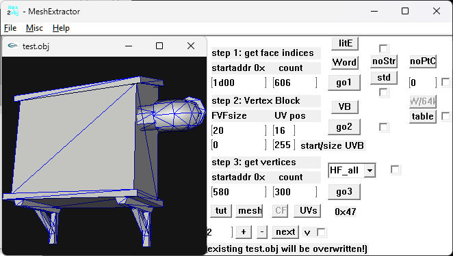 Wait, I think I did something wrong, lol. I can see other unknow block or buffer before UVs. I thought that was the start of UVs but no! So Uvs have the same count as verts after all. The format is: verts/normals buffer: 3 shorts verts, 1 short flag, 3 shorts normals, 1 short flag. unk buffer: ?? UVs buffer: 2 shorts UVs, 4 bytes unk(maybe vertex colors?) Well, it looks like that but I am not sure. About the meshes with floats is: verts/normals buffer: 3 floats verts, 1 short flag, 1 short pad, 3 floats normals, 1 short flag, 1 short pad UVs buffer: 2 shorts UVs, 4 bytes unk(maybe vertex colors?) So meshes with floats don't have that unk buffer. And like always, each buffer has a 4 bytes tag, Here is the last part of the 1st submesh, you cn see that unk buffer before UVs: