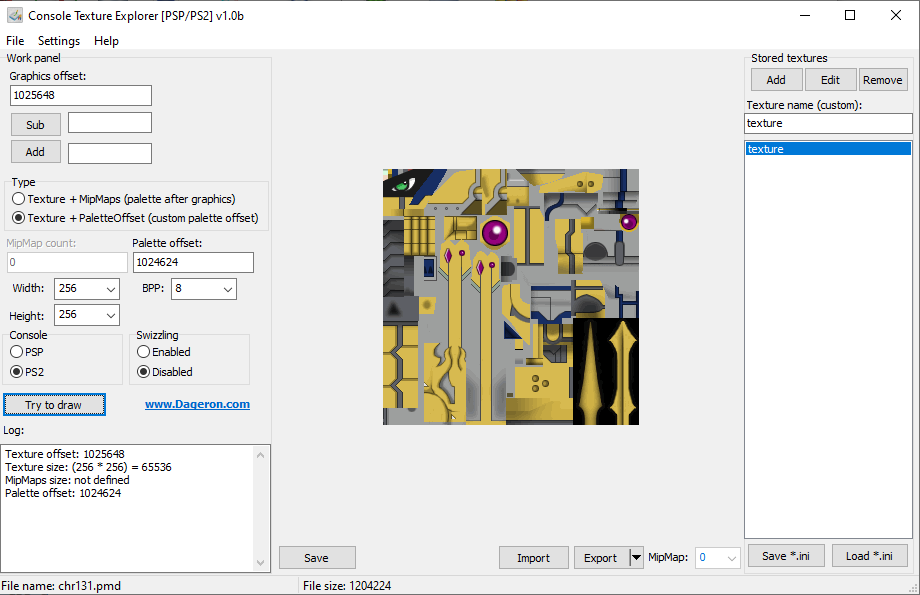 What I'm trying to do is create a new texture and trying to add an alpha channel while hex editing. The Zip File I provided is mostly for demonstration purposes. I'm trying to edit NINJA_FACE_DAMAGE_000, NINJA_FACE_DAMAGE_001, and NINJA_FACE_DAMAGE_002. My biggest problem is that the textures I'm trying to add an alpha channel to is different than it's original textures and is swizzled differently thus the alpha channel will be different. I am aware the image data will always start at 592 (0x250) and palette data differs depending on the size of the texture 64x64 (0x12A0), 128x128 (0x42A0), 256x256 (0x102D0). Anyways, I was able to use ImageHeat to get an alpha channel from the original textures with PAL8 pixel and RGBA8888 palette and exported it. Also, was able to use the ReverseBox Demo 2 to export and import the original textures just to get familiar with it. These are just a few textures that I'm trying to insert into the game and the alpha channels. MKD Texture Edit.zip1 point
