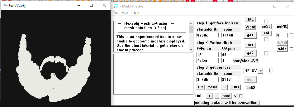 You could check the MakeH2O_log.txt. If you find a structure like 12 4 4 4 4 4 (for example) the last "4 bytes block" might be alpha uvs (just a wild guess). edit: it's 16 8 8 4 4 here Try using 82ea3, 4 for uvs. Looks promising.1 point