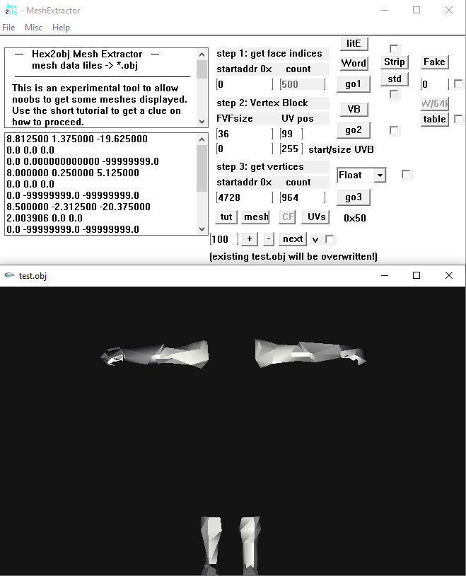 For this format it's not as hard as you may think of. It's just a matter of persistent search which some people lack of and leave it to guys like me... Be that as it may, here's a H2O example, copy the 6 lines into notepad, for example, and save as ch0001_01_whatever. Rename the .txt file to .H2O then and load the model and the H2O file into hex2obj. Press the 'mesh' button. 0x951408 11085 Vb1 32 99 0x8F8A68 5239 021010 0x0 255 ch0001_01 obj.bin seems to contain different meshes: And the start address of the concerning FI block is unknown: Being bored by this annoying FIs' start address search for each sub mesh I used meshlab again:1 point