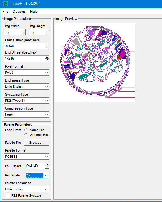 You'd be better using ImageHeat, as it has more options for swizzling, etc. For these, the image is PS2 swizzled, but I can't work out the palette. It doesn't seem to use any of the standard PS2 palette formats, maybe a different swizzling method. This is from "t_compact_rockangelz_closed_00000003":2 points