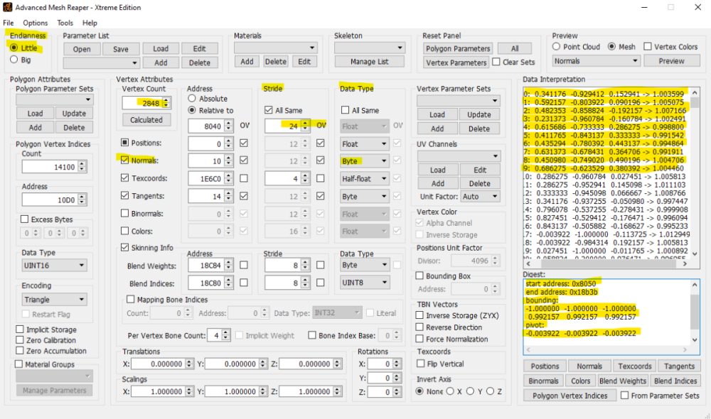 I need some help regarding the c++ script i wrote it reads normal data as floats from obj file then convert it into byte and inject it into the binary game file but some how the normals data mess will vertices data and in game the vertices explodes without normal injection the mesh works fine in game. Also that normal data is within the vertices section. I have provided pic of the AXE mesh reaper u can see normal starting offset in file as well as face count vertices every info in the image also i have provided the model file as well and my c++ code which only inject normals from obj into the binary file you can check the script and see where my mistake and correct it i will be really obliged, thanks. normal injector.rar Wei_Head.perm.zip