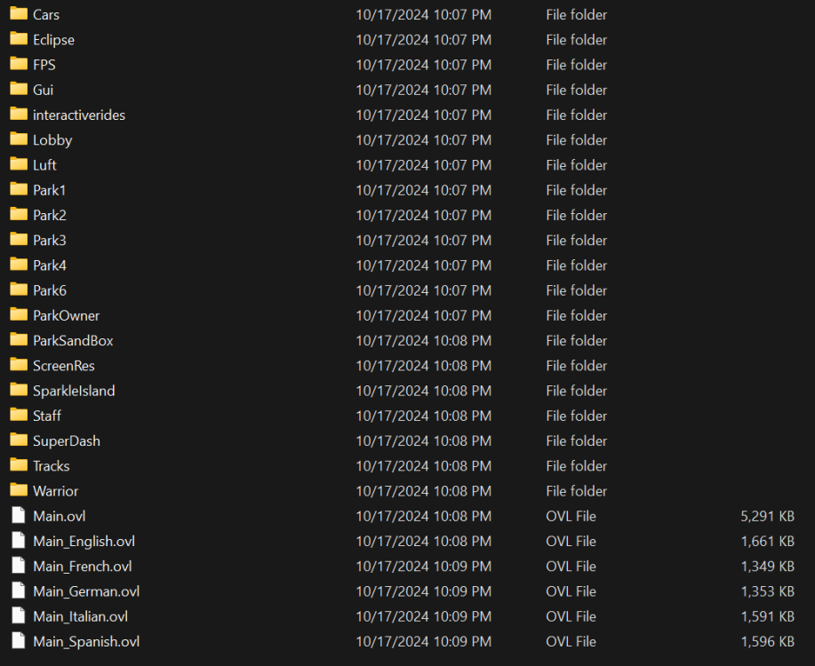 Thrillville uses primarily two archive types, .ZAP and .OVL. The zap files tend to act as a container to hold numerous ovl files. Thankfully there are already tools made that allow you to extract files from the zaps, however, all of the game assets are still locked up inside the ovl(s). I would very much like to figure out how to extract at least textures and models from the ovl files since there is no current way to extract any of the data besides the music which is stored in .aud files. Unfortunately, current tools such as Cobra Tools does not support older ovl formats: https://github.com/OpenNaja/cobra-tools/issues/132 The following image are the contents of ovldata.zap, and seems to contain pretty much everything except for music which is stored in a different zap file: Using a tool like Texture Finder, you can see that there are indeed images within the files: Later on, in the Main.ovl, you can find bits of data that represent models for the game (likely in .mdl) Here is a rar with the Main.ovl, TitleScreen.ovl, and Main_English.ovl (Main has a bunch of random stuff in it, TitleScreen only has one image, and Main_English seems to be localization strings): ovl.rar I'm not sure if the format is the same for Thrillville: Off the Rails, but it's possible that if an extraction method is made then it can also extract the files from that as well. Off the Rails is even on Steam, so it may be a bit more convenient to access the files: https://store.steampowered.com/app/6080/Thrillville_Off_the_Rails/
