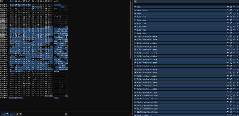 ue4.26.2 I am researching the pak files of Unreal Engine, and of course, I know that many people have already studied them and there are ready-made tools available. I hope to know more information because I cannot find any relevant information on Google search. I encountered a problem in the second offset area of the pak file index information area. I don't understand what 8-byte data is? The 4-byte data following this 8-byte data corresponds to the 4-byte data following the file path in the third offset area of the pak file index information area, and should be used to point to the file path. I repackaged the same file using "UnrealPak. exe" from ue4.26.2, and this 8-byte data still appears, but it is different. ”29 E5 C2 64 38 D1 8A A6 "This is the byte I want to know. I have provided the pak file in the attachment, which includes the file index information area after AES decryption, the pak file, and the bookmarks I have organized myself using imhex. Or please tell me where to find the source code for version 4.26.2 of 'UnrealPak. exe', as I am not sure if it is open source. I hope to receive your help, thank you. pak.zip