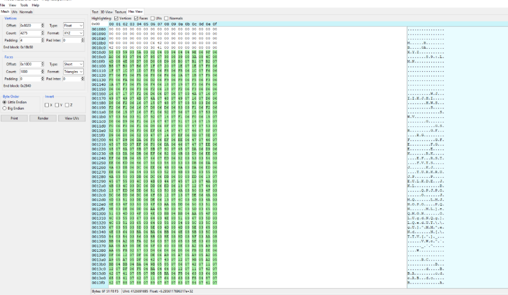 Hey! I've been looking into the files for Apple's SceneKit used in the Animoji app, specifically the .scnz files. In the main.scnz file, at offset 1DC50, there seem to be repeating structures that might indicate 3D model data. However, I haven't had any success extracting anything meaningful with tools like Hex2Obj. The file also appears to have some kind of compression applied. If anyone has experience with these files or knows of tools or methods that could help, I'd greatly appreciate it! SCNZ files can be found in extracted IPSW firmware under the following directory: System\Library\PrivateFrameworks\AvatarKit.framework\memoji\assets\head\head.aa SCNZ.zip