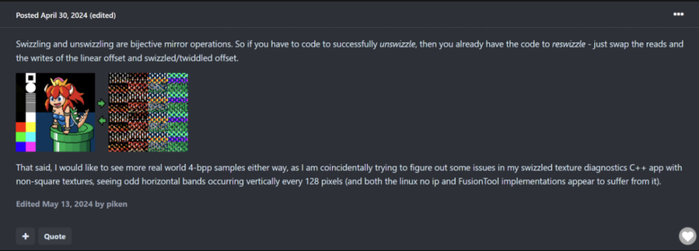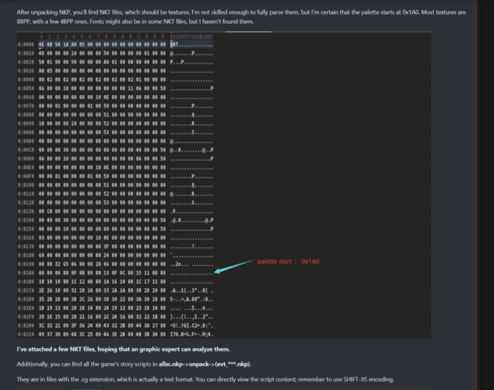 i need help with a custom texture format to unswizzle for the ps2 game NANA. If you could help me achieve this in any way it would be a great help as i could get to work on fantranslating the game. I am putting a 65$ USD LTC/BTC bounty on anyone who can successfully unswizzle this format, and it will be paid to the first person who can provide the function or proof that they can unswizzle the current texture format. Please contact me on my social platforms for this : @mxlg on discord and @mxlgborn on telegram. This image ^ is what i got in tile molester, from using 8x8 block size 32bpp RGBA, on 2 dimensions with the custom block size. i still see the swizzling, and also i have this image with 24x24: also here is the sample files you can test in tilemolester or any file explorer: https://www.mediafire.com/folder/gx88877fgxwye/NKT The issues are the unswizzle method. The pallete starts at 0x1A0 and the texture at 0x5A0. The width and the height it seems is 256x512, the color depth is 8bpp.