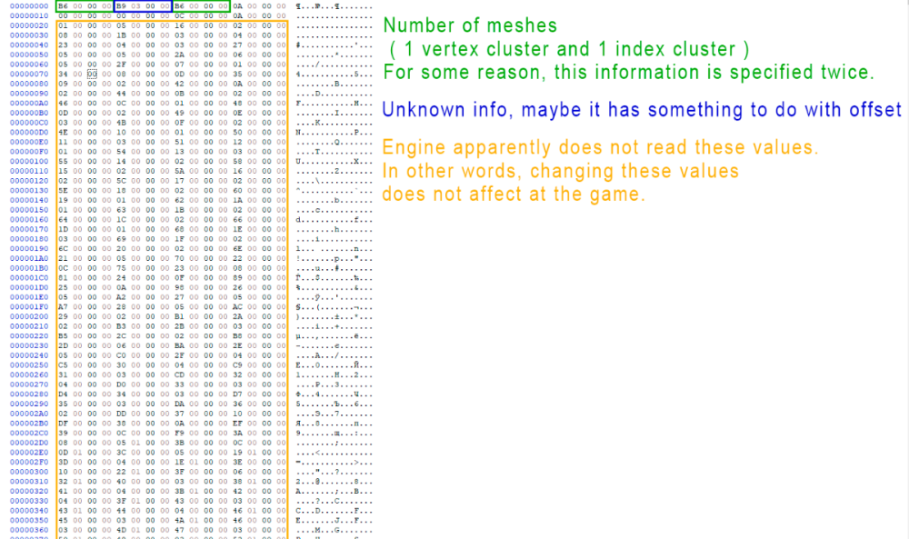 After the information marked in orange comes the following: 4 byte value about the number of vertices, 4 byte value about the number of indices, vertices, indices. And so on.