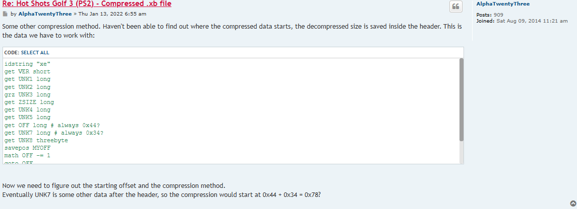 Sol Naciente Posted September 25 Posted September 25 Trying to rip some audio from Hot Shots Golf Fore, but I'm not having any luck decompressing these .XB files. I found some clues from the ZenHax forums about this exact problem with a similar game from the same developers (Clap Hanz), but it's all very foreign to me... Anyone able to take a crack at this? https://www.zenhax.com/viewtopic.php@t=16364.html HotShotsGolfFore_XB.zip