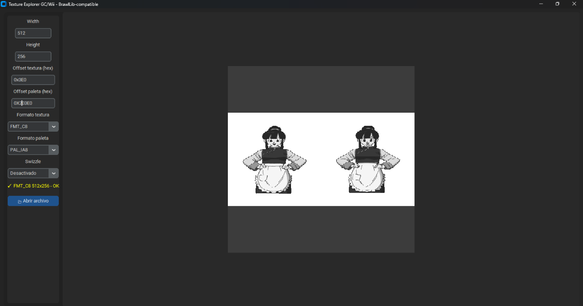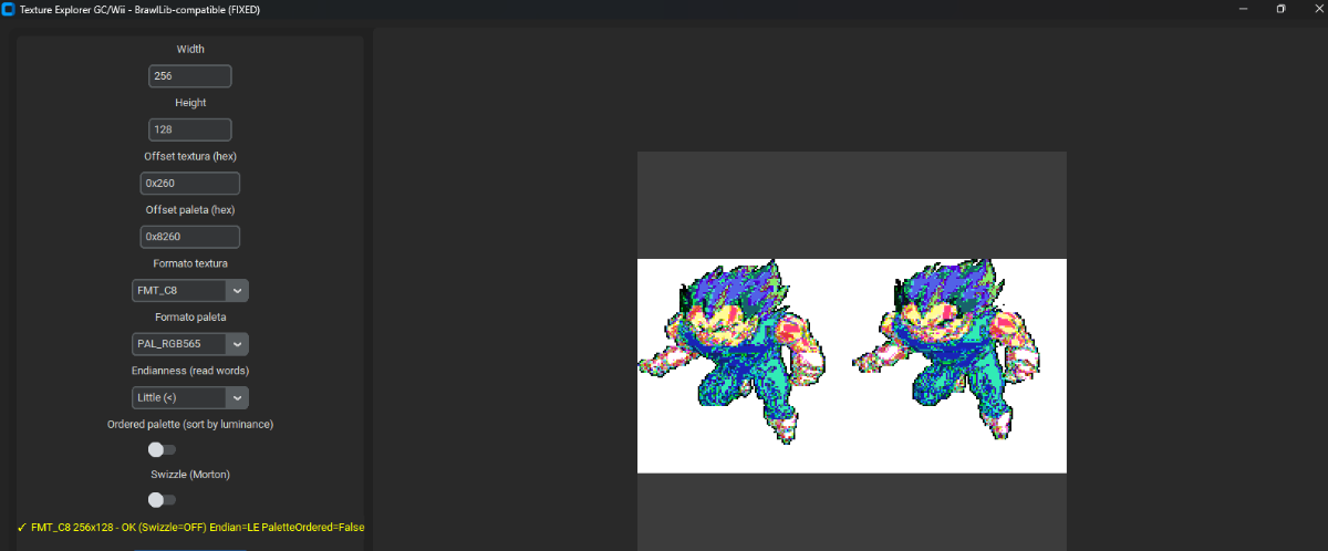 NocturnalRhys Posted September 29 Posted September 29 Hi! I was working on my Console Texture Explorer project for GameCube/Wii and uploading it. I'd like to try it first with .dbt files. I'm not sure if I know much about the format, since most palettes use little endian or big endian ordering. I also don't know much about the Wii texture format. Could you help me? I want to finish this tool to make one for PlayStation 2, and then for PSP and PS1. I have some information about this, but I'm still having some trouble. Would you please help me understand more or make a script to extract it and explain it? That would be enough although I don't know if I'm putting the values correctly, or if they are the decoders I make in the .py - 1 Red: the container file header - blue: item count - yellow: item offset - 2 Light green: items, each 0x60 bytes - blue: pixel offset (optional) - yellow: palette offset (optional) - pink: pixel size - light blue: palette size - black 1 = 1 << width - black 2 = 1 << height - brown, format palette clut? - native texture format. NOTE: An item is not necessarily a texture; it can also be a free palette. - 3 Dark green: texture and palette data GC/Wii this is result of research of GX sdk GX_FMT_I4 = 0, GX_FMT_I8 = 1, GX_FMT_IA4 = 2, GX_FMT_IA8 = 3, GX_FMT_RGB565 = 4, GX_FMT_RGB5A3 = 5, GX_FMT_RGBA8 = 6, GX_FMT_C4 = 8,//indexed 16 GX_FMT_C8 = 9,//indexed 256 GX_FMT_C14X2 = 0xA,//indexed(16 bits) 0x3FFF GX_FMT_CMPR = 0xE;//swizzled DXT1 GC/Wii CLUT format GX_PAL_IA8 = 0, GX_PAL_RGB565 = 1, GX_PAL_RGB5A3 = 2; I want to thank and give credit for this information to dianadevs (a friend and expert engineer from my research group) for the information about these values, and the structuring of the .dbt files DBT Samples.zip